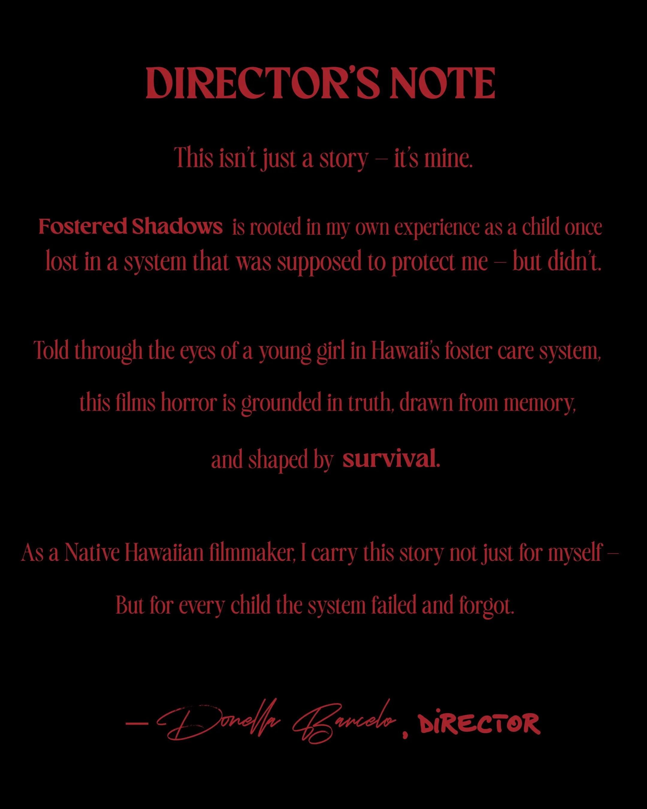 Fostered Shadows follows a young girl and her siblings as they navigate the foster care system in Hawai’i, confronting the fear, silence, and resilience that shape their childhood. Fostered Shadows uncovers the trauma, cultural identity, and haunting cycles that too often go unnoticed.